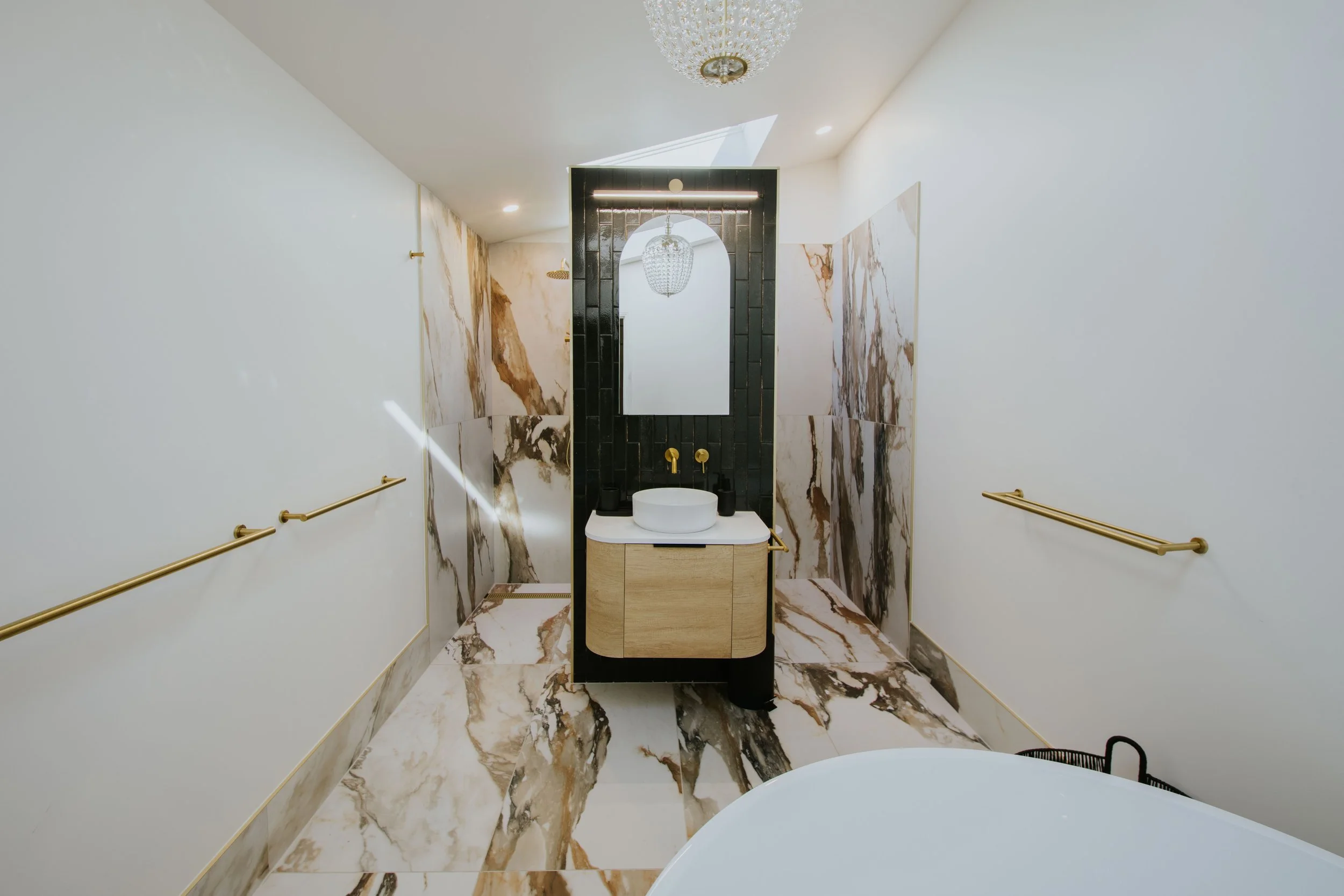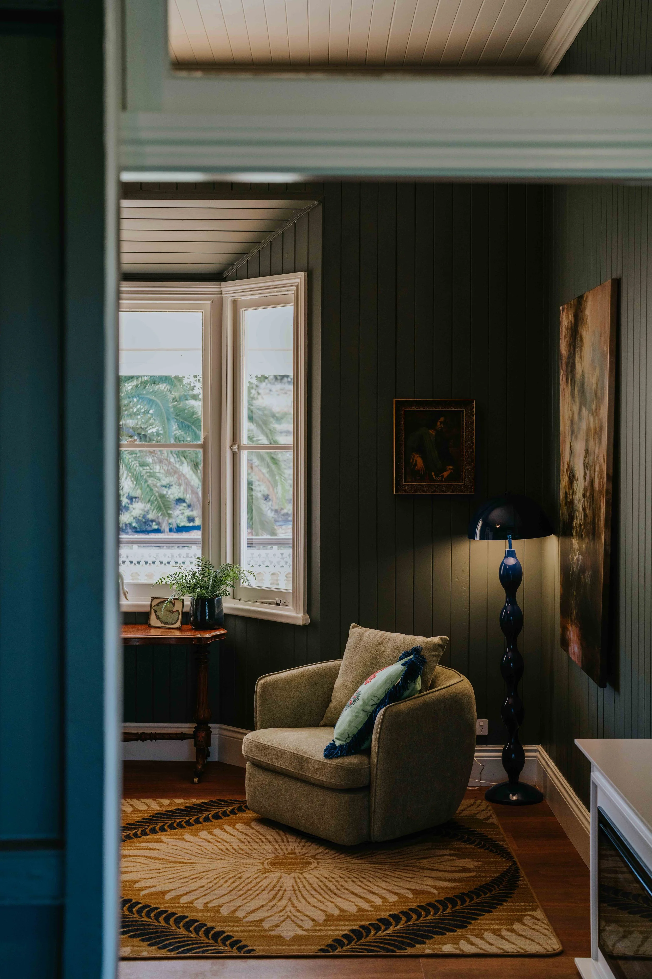 Behind the classic Queenslander exterior lies a gingerly composed interior: antique and collectible pieces gathered from near and far, furniture with stories, art chosen for intrigue and lingering looks. There is a sense of English country estate about the place—layered, elegant, slightly irreverent—offset by sharp contemporary moments: an all-black kitchen, expansive marble, light-filled bathrooms that open to the sky at the touch of a button.